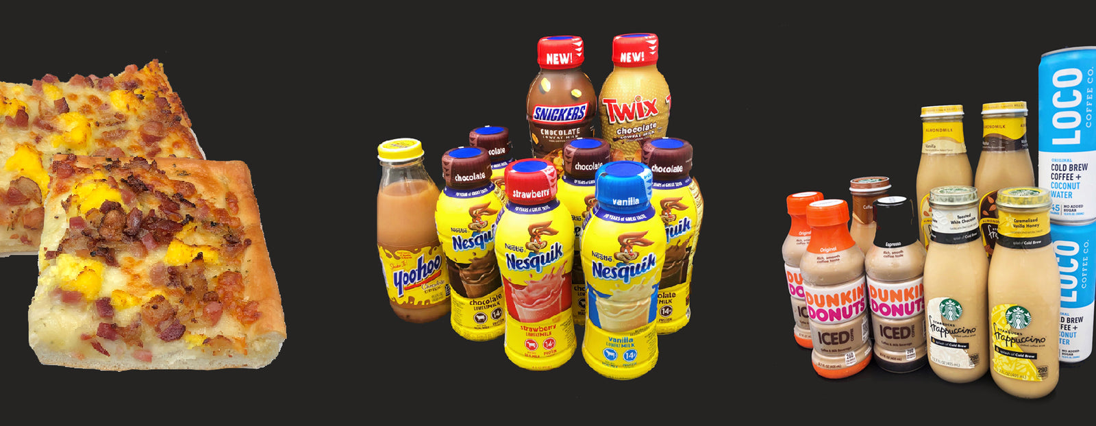 We make fresh in our store breakfast pizzas and have a large selection of iced coffees and fruit drinks