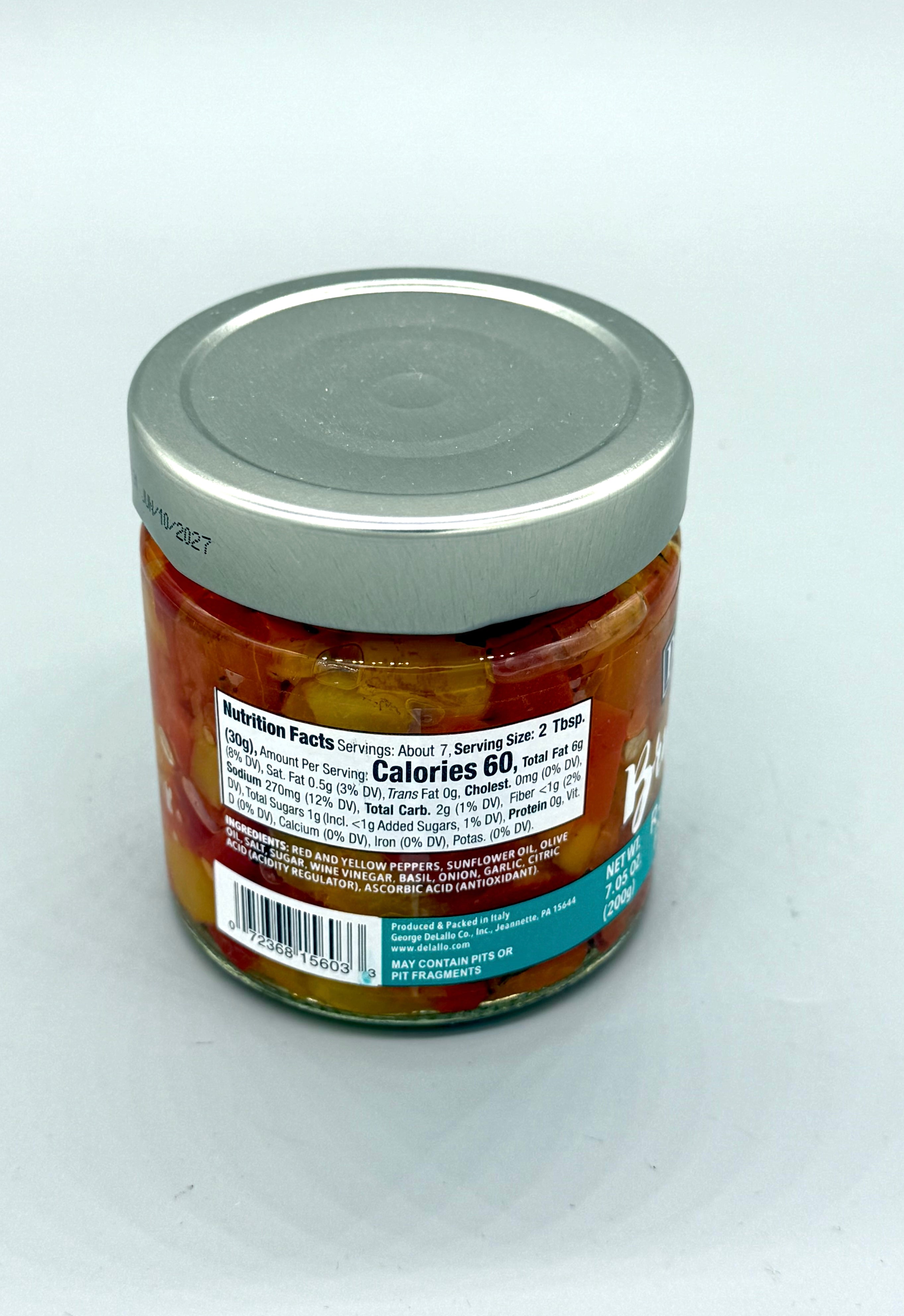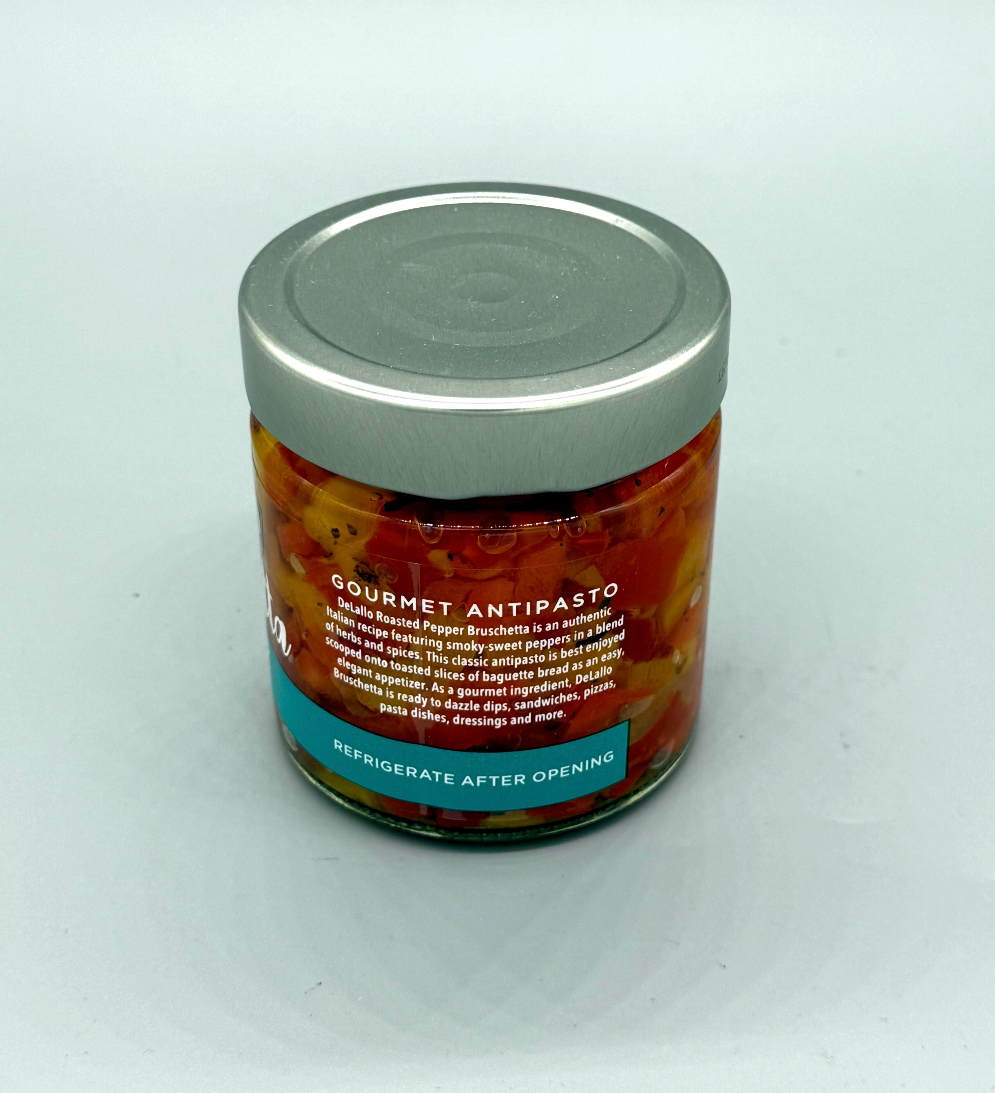 Roasted red and yellow peppers marinated in oil with capers, herbs, and garlic. Made in Italy since 1950, this is ready-to-use bruschetta topping that brings smoky-sweet roasted pepper flavor with Mediterranean seasoning. The peppers are already roasted, chopped, and marinated, so they're ready to use straight from the jar without any prep work.
